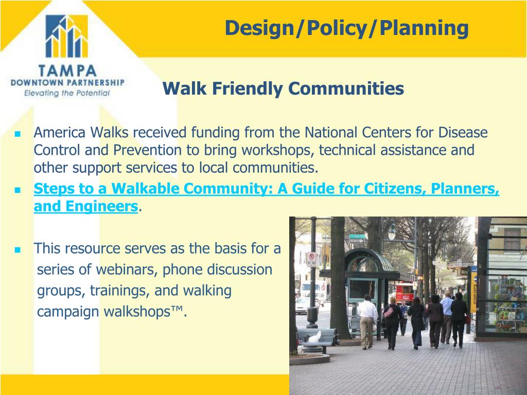 Design/Policy/Planning Walk Friendly Communities • America Walks received funding from the National Centers for Disease Control and Prevention to bring workshops, technical assistance and other support services to local communities. • Steps to a Walkable Community: A Guide for Citizens, Planners, and Engineers. • This resource serves as the basis for a series of webinars, phone discussion groups, trainings, and walking campaign walkshops™.