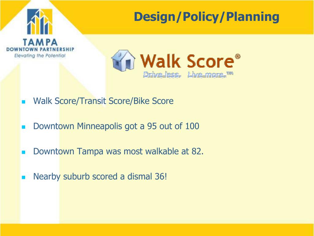 Design/Policy/Planning • Walk Score/Transit Score/Bike Score • Downtown Minneapolis got a 95 out of 100 • Downtown Tampa was most walkable at 82. • Nearby suburb scored a dismal 36!