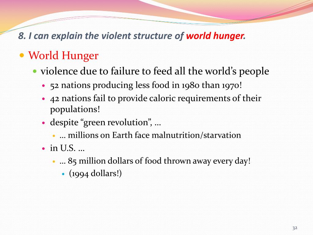 8. I can explain the violent structure of world hunger. • World Hunger • violence due to failure to feed all the world’s people • 52 nations producing less food in 1980 than 1970! • 42 nations fail to provide caloric requirements of their populations! • despite “green revolution”, … • … millions on Earth face malnutrition/starvation • in U.S. … • … 85 million dollars of food thrown away every day! • (1994 dollars!)