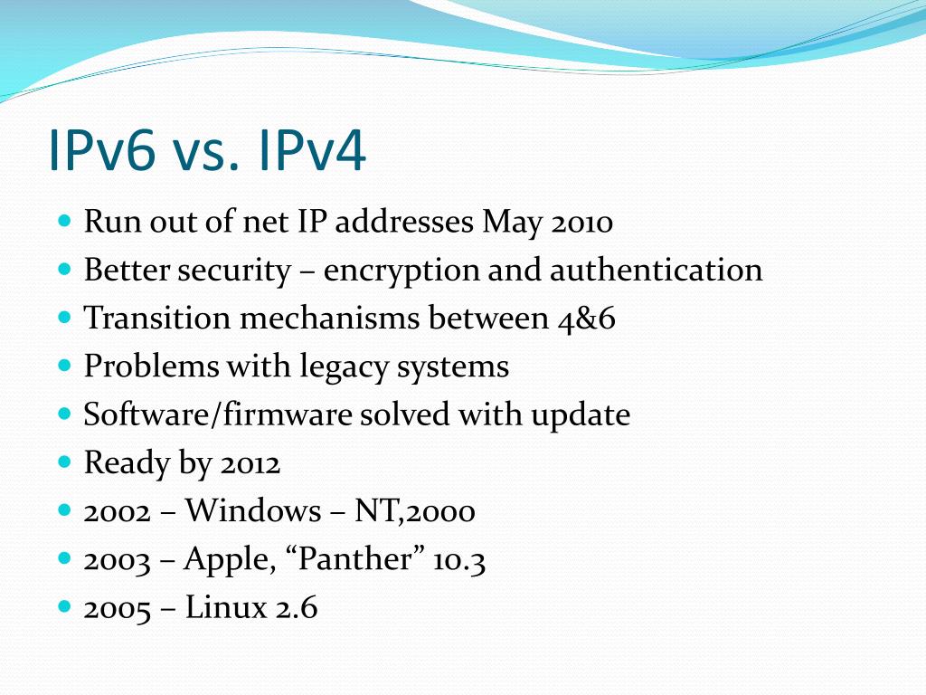 IPv6 vs. IPv4 • Run out of net IP addresses May 2010 • Better security – encryption and authentication • Transition mechanisms between 4&6 • Problems with legacy systems • Software/firmware solved with update • Ready by 2012 • 2002 – Windows – NT,2000 • 2003 – Apple, “Panther” 10.3 • 2005 – Linux 2.6