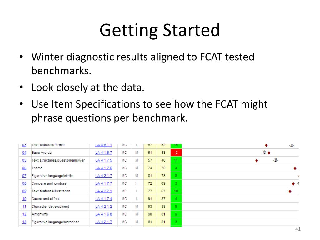 Getting Started • Winter diagnostic results aligned to FCAT tested benchmarks. • Look closely at the data. • Use Item Specifications to see how the FCAT might phrase questions per benchmark.