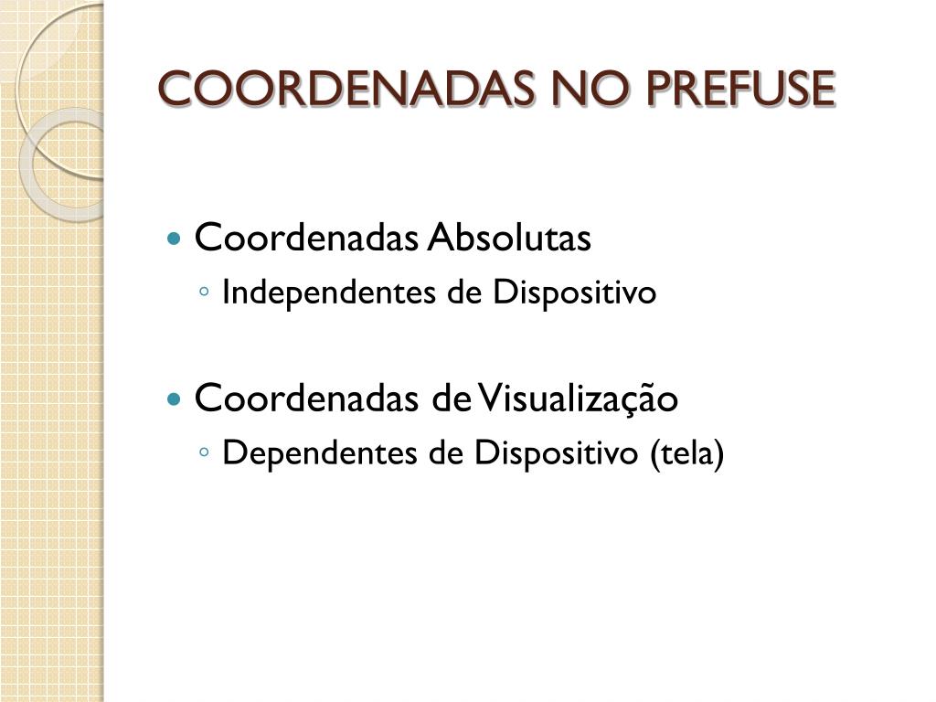 COORDENADAS NO PREFUSE • Coordenadas Absolutas • Independentes de Dispositivo • Coordenadas de Visualização • Dependentes de Dispositivo (tela)