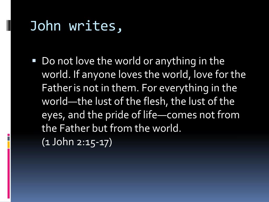 John writes, • Do not love the world or anything in the world. If anyone loves the world, love for the Fatheris not in them. For everything in the world—the lust of the flesh, the lust of the eyes, and the pride of life—comes not from the Father but from the world. (1 John 2:15-17)
