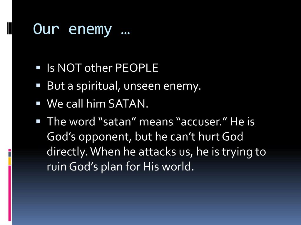 Our enemy … • Is NOT other PEOPLE • But a spiritual, unseen enemy. • We call him SATAN. • The word “satan” means “accuser.” He is God’s opponent, but he can’t hurt God directly. When he attacks us, he is trying to ruin God’s plan for His world.