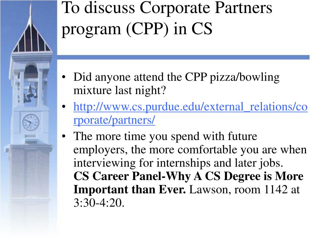 To discuss Corporate Partners program (CPP) in CS • Did anyone attend the CPP pizza/bowling mixture last night? • http://www.cs.purdue.edu/external_relations/corporate/partners/ • The more time you spend with future employers, the more comfortable you are when interviewing for internships and later jobs. CS Career Panel-Why A CS Degree is More Important than Ever. Lawson, room 1142 at 3:30-4:20.