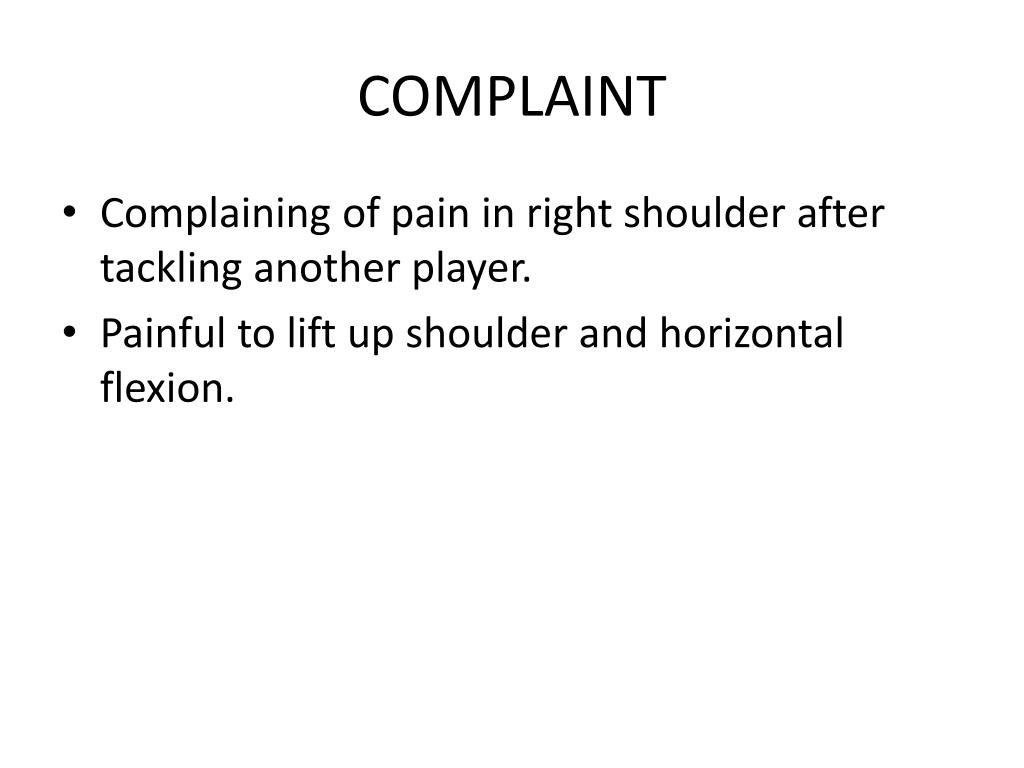 COMPLAINT • Complaining of pain in right shoulder after tackling another player. • Painful to lift up shoulder and horizontal flexion.
