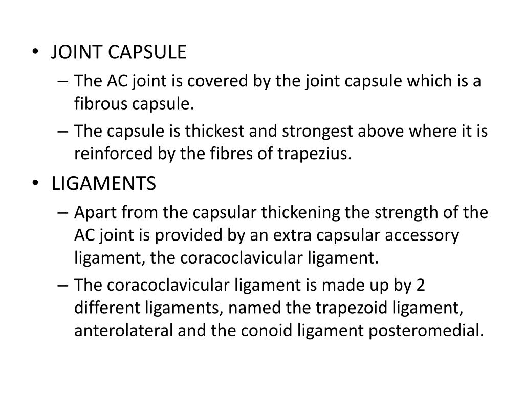 JOINT CAPSULE • The AC joint is covered by the joint capsule which is a fibrous capsule. • The capsule is thickest and strongest above where it is reinforced by the fibres of trapezius. • LIGAMENTS • Apart from the capsular thickening the strength of the AC joint is provided by an extra capsular accessory ligament, the coracoclavicular ligament. • The coracoclavicular ligament is made up by 2 different ligaments, named the trapezoid ligament, anterolateral and the conoid ligament posteromedial.