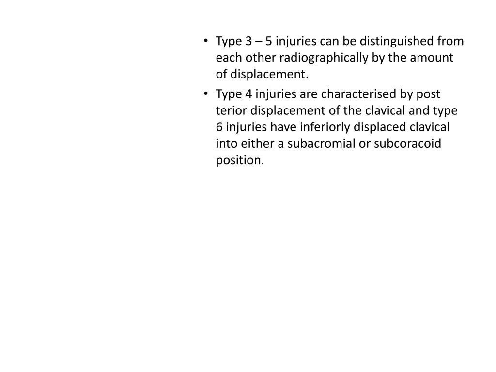 Type 3 – 5 injuries can be distinguished from each other radiographically by the amount of displacement. • Type 4 injuries are characterised by post terior displacement of the clavical and type 6 injuries have inferiorly displaced clavical into either a subacromial or subcoracoid position.