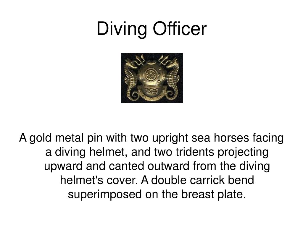 Diving Officer A gold metal pin with two upright sea horses facing a diving helmet, and two tridents projecting upward and canted outward from the diving helmet's cover. A double carrick bend superimposed on the breast plate.