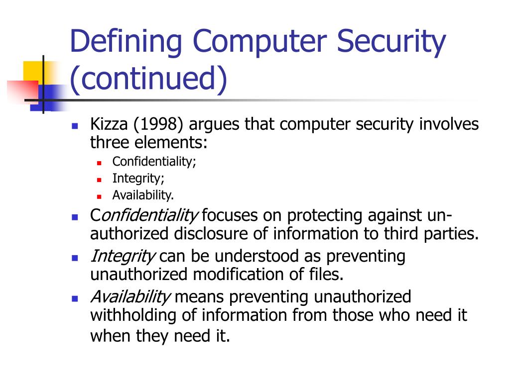 Defining Computer Security (continued) • Kizza (1998) argues that computer security involves three elements: • Confidentiality; • Integrity; • Availability. • Confidentiality focuses on protecting against un- authorized disclosure of information to third parties. • Integrity can be understood aspreventing unauthorized modification of files. • Availability means preventing unauthorized withholding of information from those who need it when they need it.