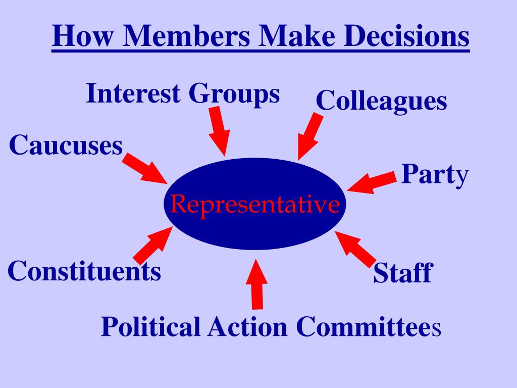How Members Make Decisions Interest Groups Colleagues Caucuses Party Representative Constituents Staff Political Action Committees