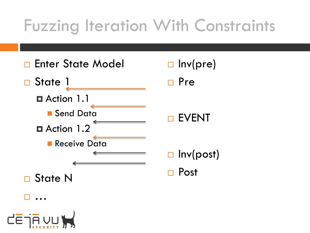Fuzzing Iteration With Constraints • Enter State Model • State 1 • Action 1.1 • Send Data • Action 1.2 • Receive Data • State N • … • Inv(pre) • Pre • EVENT • Inv(post) • Post