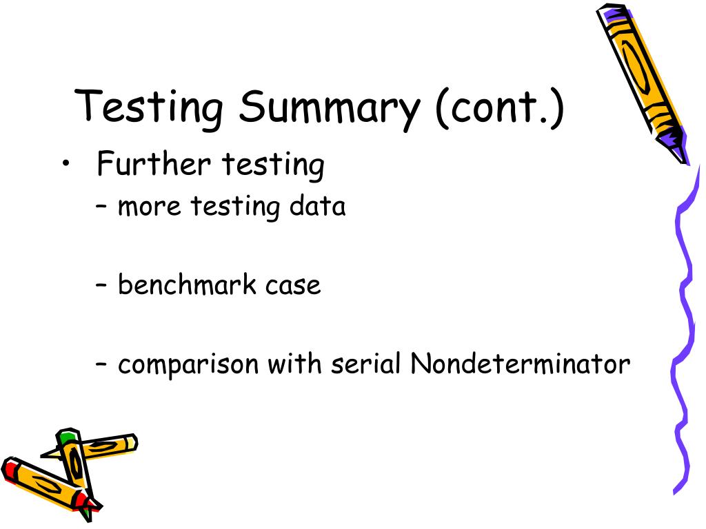 Testing Summary (cont.) • Further testing • more testing data • benchmark case • comparison with serial Nondeterminator