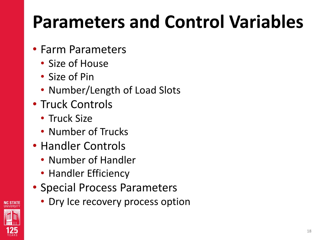 Parameters and Control Variables • Farm Parameters • Size of House • Size of Pin • Number/Length of Load Slots • Truck Controls • Truck Size • Number of Trucks • Handler Controls • Number of Handler • Handler Efficiency • Special Process Parameters • Dry Ice recovery process option