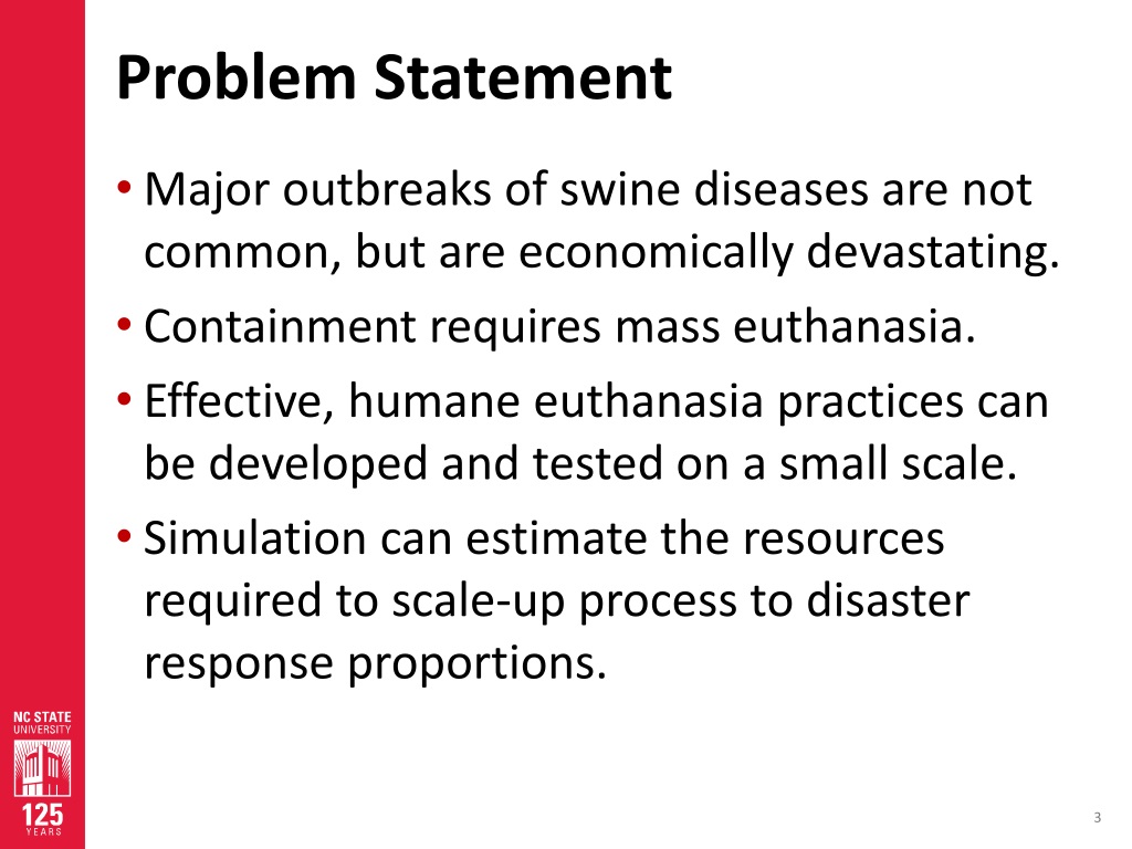 Problem Statement Major outbreaks of swine diseases are not common, but are economically devastating. Containment requires mass euthanasia. Effective, humane euthanasia practices can be developed and tested on a small scale. Simulation can estimate the resources required to scale-up process to disaster response proportions.