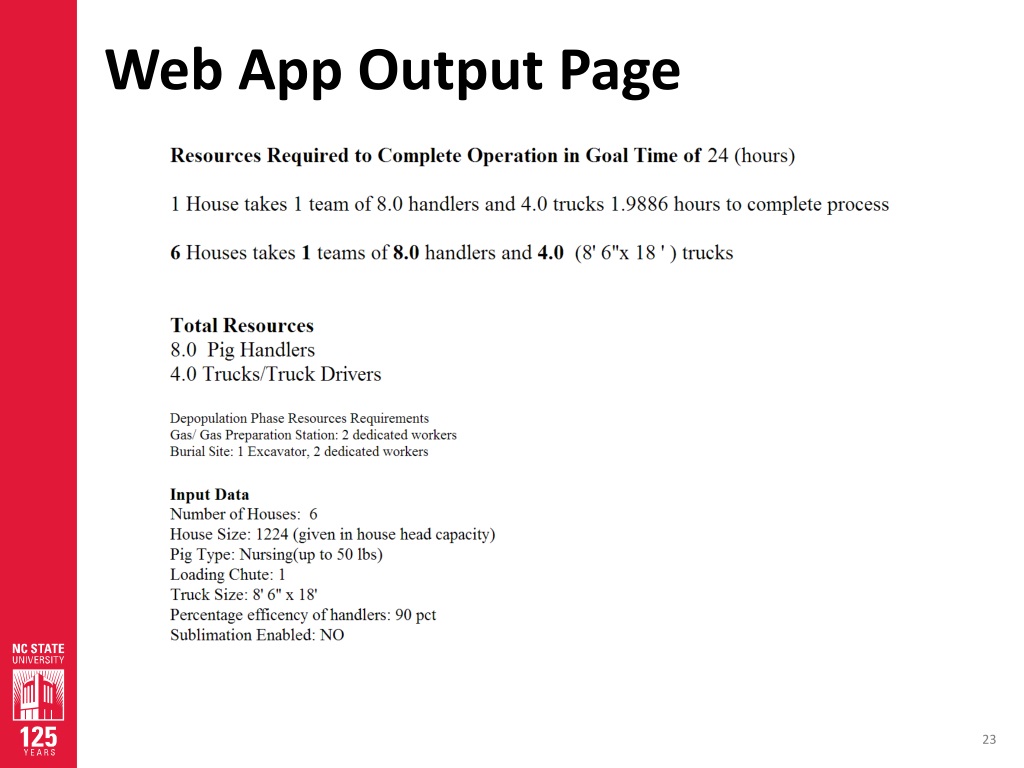 Conclusion Swine health disasters deserve advance planning. Simulation provided a viable method for estimating the requirements when scaling up a new process. Data was collected through careful studies of portions of current processes. Results of simulation model were encapsulated in web application. Web application requires no special software or training to use.