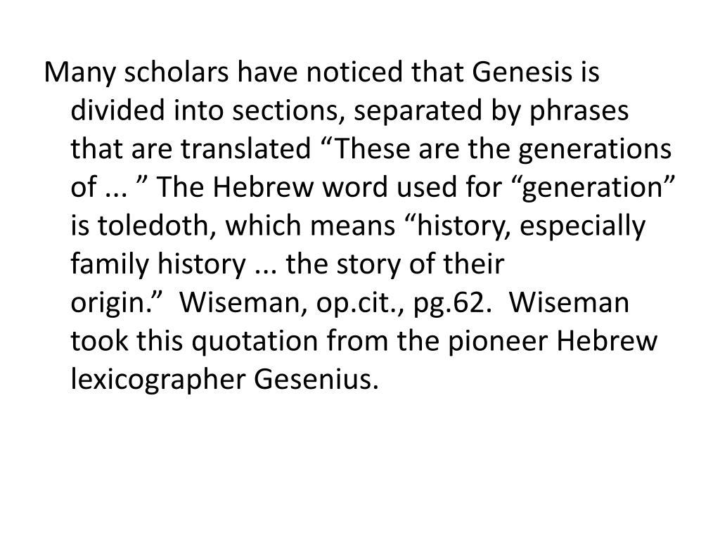 Many scholars have noticed that Genesis is divided into sections, separated by phrases that are translated “These are the generations of ... ” The Hebrew word used for “generation” is toledoth, which means “history, especially family history ... the story of their origin.” Wiseman, op.cit., pg.62. Wiseman took this quotation from the pioneer Hebrew lexicographer Gesenius.