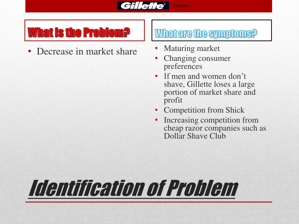 (Gillette) What is the Problem? What are the symptoms? Maturing market Changing consumer preferences If men and women don’t shave, Gillette loses a large portion of market share and profit Competition from Shick Increasing competition from cheap razor companies such as Dollar Shave Club • Decrease in market share Identification of Problem
