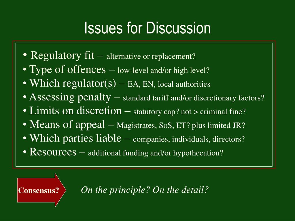 Issues for Discussion • Regulatory fit –alternative or replacement? • Type of offences –low-level and/or high level? • Which regulator(s) – EA, EN, local authorities • Assessing penalty – standard tariff and/or discretionary factors? • Limits on discretion – statutory cap? not > criminal fine? • Means of appeal – Magistrates, SoS, ET? plus limited JR? • Which parties liable – companies, individuals, directors? • Resources – additional funding and/or hypothecation? Consensus? On the principle? On the detail?