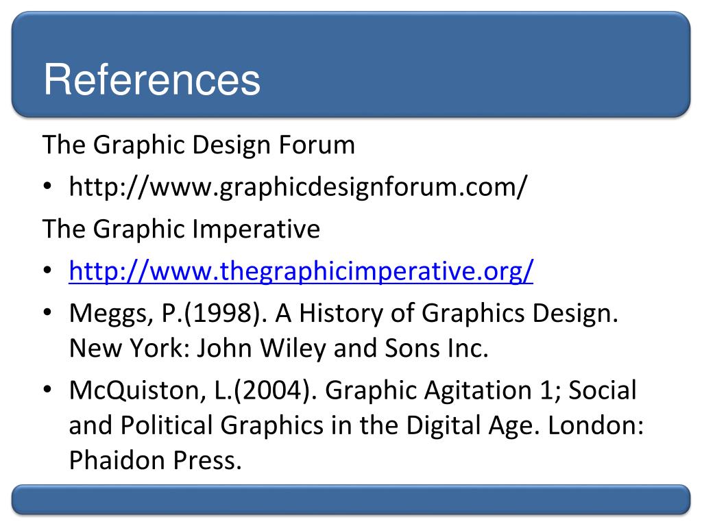 References The Graphic Design Forum • http://www.graphicdesignforum.com/ The Graphic Imperative • http://www.thegraphicimperative.org/ • Meggs, P.(1998). A History of Graphics Design. New York: John Wiley and Sons Inc. • McQuiston, L.(2004). Graphic Agitation 1; Social and Political Graphics in the Digital Age. London: Phaidon Press.