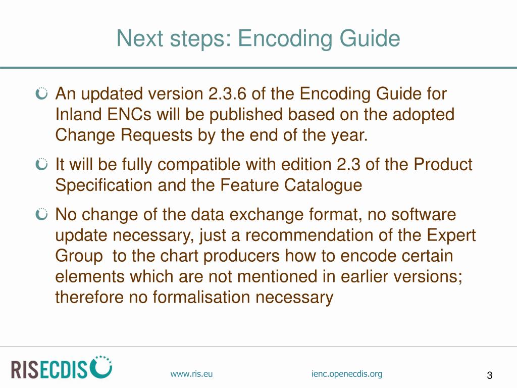 Next steps: Encoding Guide • An updated version 2.3.6 of the Encoding Guide for Inland ENCs will be published based on the adopted Change Requests by the end of the year. • Itwill be fully compatible with edition 2.3 of the Product Specification and the Feature Catalogue • No change of the data exchange format, no software update necessary, just a recommendation of the Expert Group to the chart producers how to encode certain elements which are not mentioned in earlier versions; therefore no formalisation necessary 3