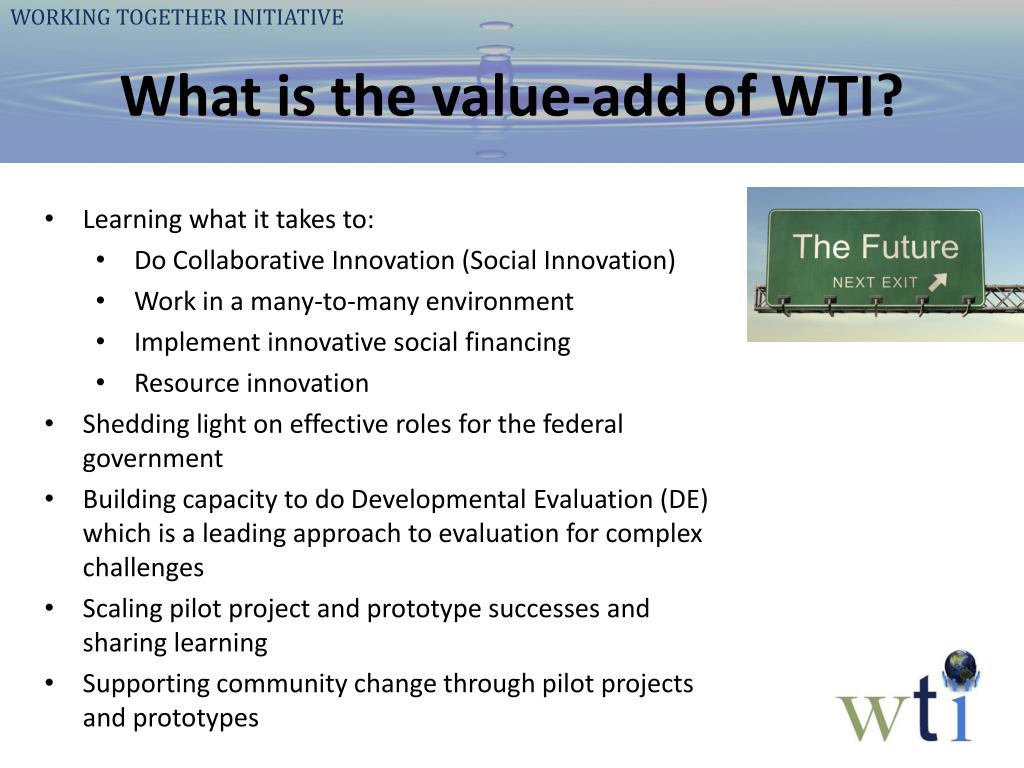 WORKING TOGETHER INITIATIVE What is the value-add of WTI? • Learning what it takes to: • Do Collaborative Innovation (Social Innovation) • Work in a many-to-many environment • Implement innovative social financing • Resource innovation • Shedding light on effective roles for the federal government • Building capacity to do Developmental Evaluation (DE) which is a leading approach to evaluation for complex challenges • Scaling pilot project and prototype successes and sharing learning • Supporting community change through pilot projects and prototypes
