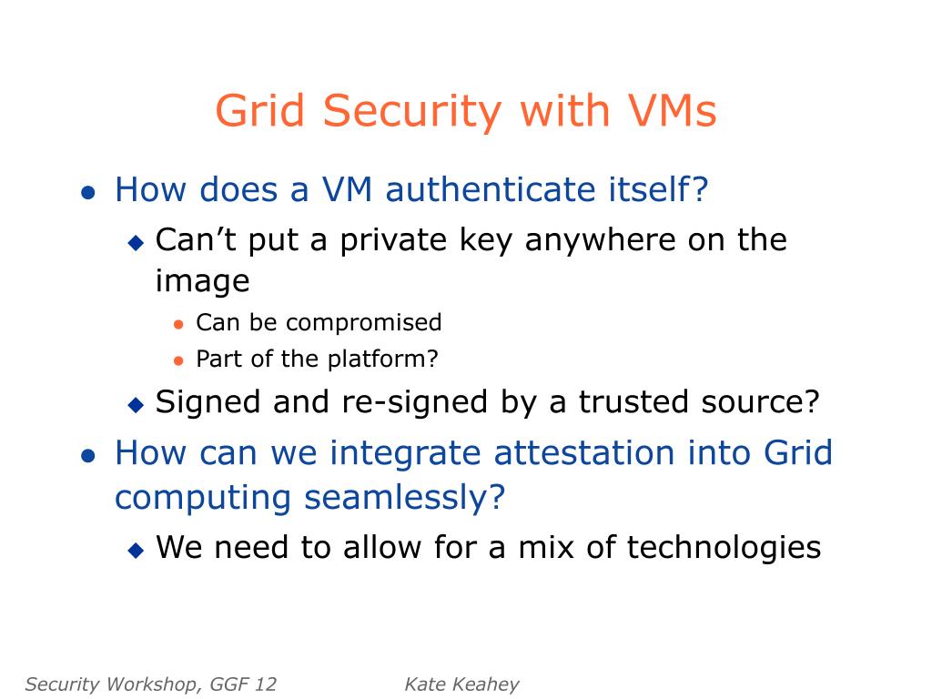 Grid Security with VMs • How does a VM authenticate itself? • Can’t put a private key anywhere on the image • Can be compromised • Part of the platform? • Signed and re-signed by a trusted source? • How can we integrate attestation into Grid computing seamlessly? • We need to allow for a mix of technologies Kate Keahey