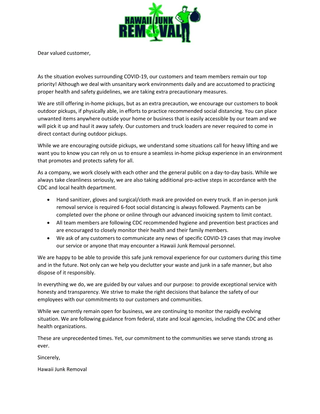 Dear valued customer, As the situation evolves surrounding COVID-19, our customers and team members remain our top priority! Although we deal with unsanitary work environments daily and are accustomed to practicing proper health and safety guidelines, we are taking extra precautionary measures. We are still offering in-home pickups, but as an extra precaution, we encourage our customers to book outdoor pickups, if physically able, in efforts to practice recommended social distancing. You can place unwanted items anywhere outside your home or business that is easily accessible by our team and we will pick it up and haul it away safely. Our customers and truck loaders are never required to come in direct contact during outdoor pickups. While we are encouraging outside pickups, we understand some situations call for heavy lifting and we want you to know you can rely on us to ensure a seamless in-home pickup experience in an environment that promotes and protects safety for all. As a company, we work closely with each other and the general public on a day-to-day basis. While we always take cleanliness seriously, we are also taking additional pro-active steps in accordance with the CDC and local health department. •Hand sanitizer, gloves and surgical/cloth mask are provided on every truck. If an in-person junk removal service is required 6-foot social distancing is always followed. Payments can be completed over the phone or online through our advanced invoicing system to limit contact. •All team members are following CDC recommended hygiene and prevention best practices and are encouraged to closely monitor their health and their family members. •We ask of any customers to communicate any news of specific COVID-19 cases that may involve our service or anyone that may encounter a Hawaii Junk Removal personnel. We are happy to be able to provide this safe junk removal experience for our customers during this time and in the future. Not only can we help you declutter your waste and junk in a safe manner, but also dispose of it responsibly. In everything we do, we are guided by our values and our purpose: to provide exceptional service with honesty and transparency. We strive to make the right decisions that balance the safety of our employees with our commitments to our customers and communities. While we currently remain open for business, we are continuing to monitor the rapidly evolving situation. We are following guidance from federal, state and local agencies, including the CDC and other health organizations. These are unprecedented times. Yet, our commitment to the communities we serve stands strong as ever. Sincerely, Hawaii Junk Removal