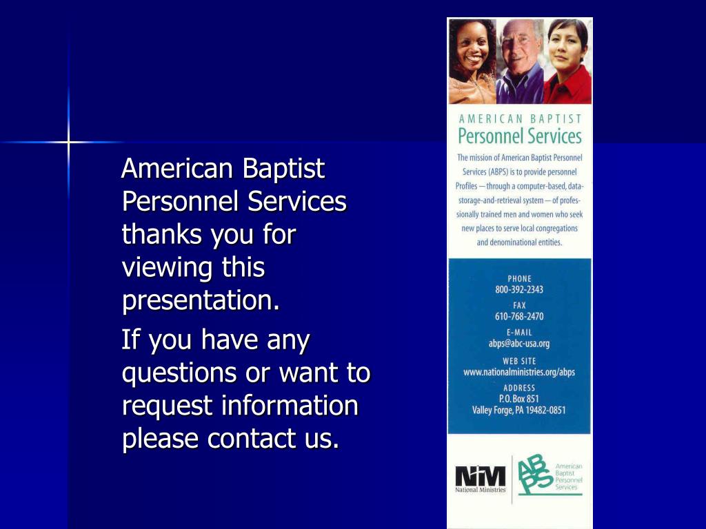 American Baptist Personnel Services thanks you for viewing this presentation. If you have any questions or want to request information please contact us.