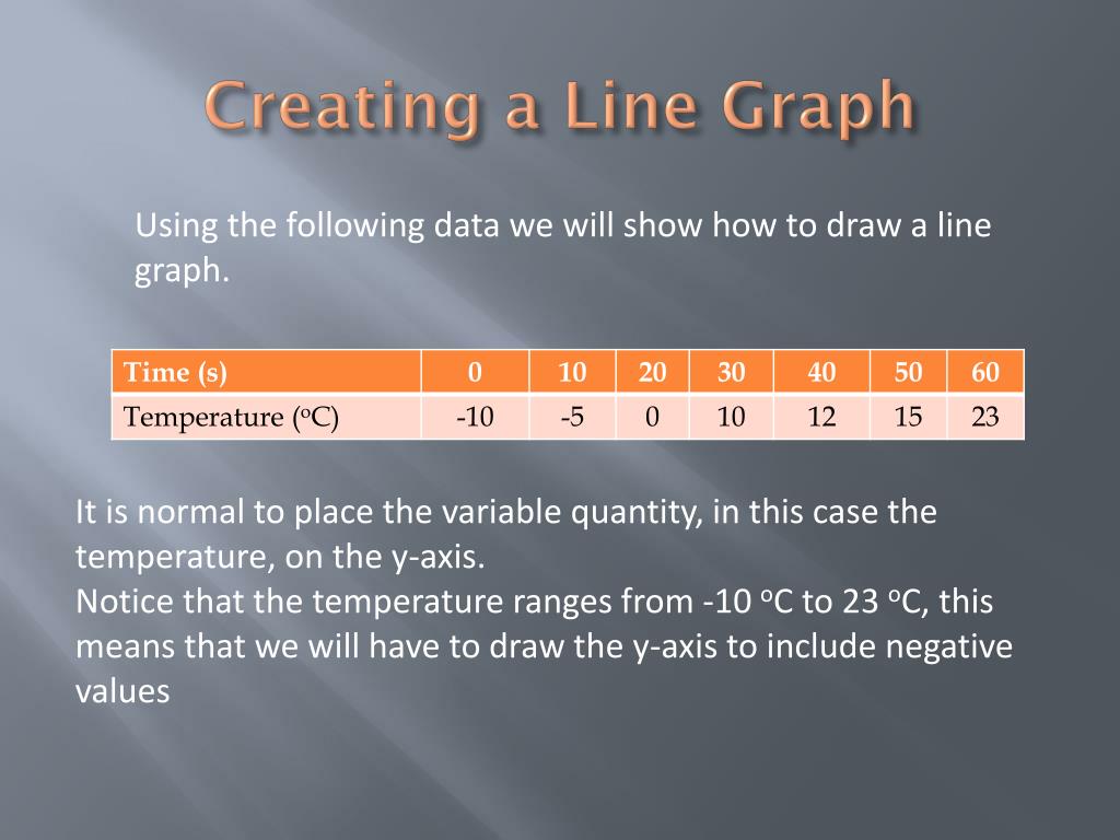 Creating a Line Graph. A step by step guide. Creating a Line Graph. Using the following data we will show how to draw a line graph. It is normal to place the variable quantity, in this case the temperature, on the y-axis.