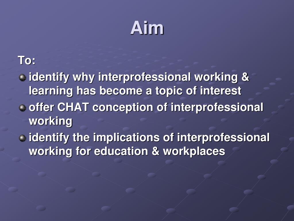 Aim To: • identify why interprofessional working & learning has become a topic of interest • offer CHAT conception of interprofessional working • identify the implications of interprofessional working for education & workplaces