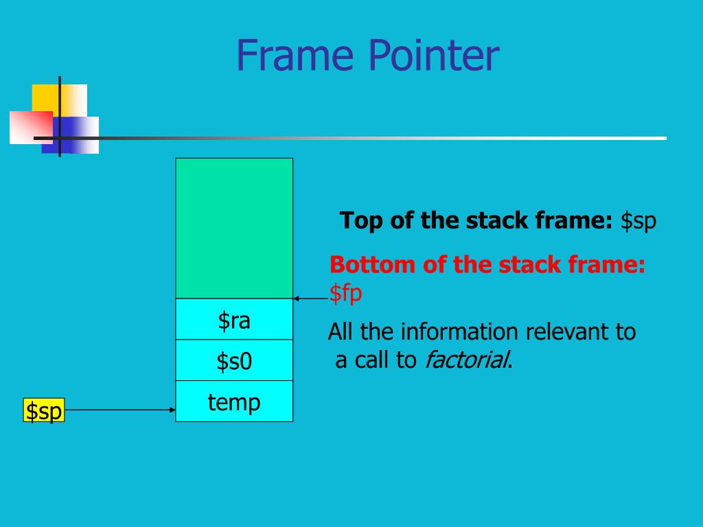 Bottom of the stack frame: $fp $sp Frame Pointer Top of the stack frame: $sp $ra All the information relevant to a call to factorial. $s0 temp