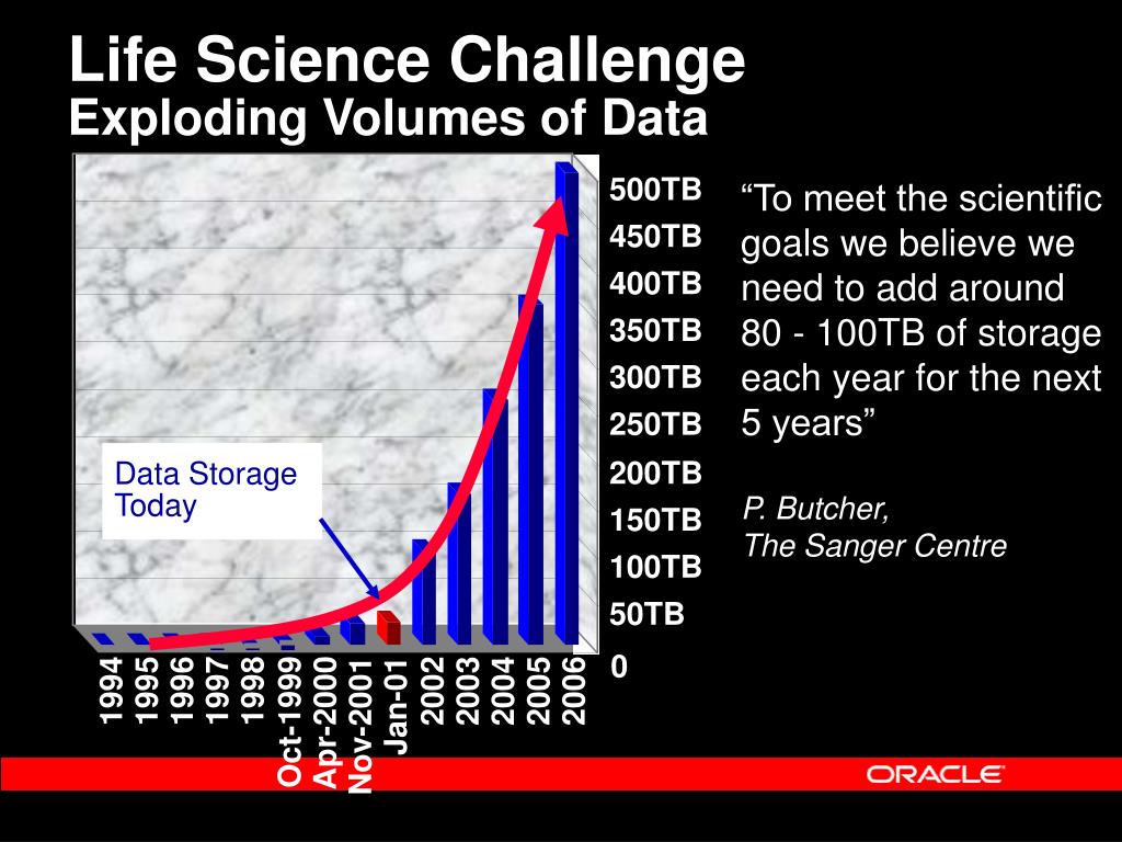 Life Science Challenge Exploding Volumes of Data 500TB “To meet the scientific goals we believe we need to add around 80 - 100TB of storage each year for the next 5 years”P. Butcher, The Sanger Centre 450TB 400TB 350TB 300TB 250TB Data StorageToday 200TB 150TB 100TB 50TB 0 1994 1995 1996 1997 1998 2002 2003 2004 2005 2006 Jan-01 Oct-1999 Apr-2000 Nov-2001