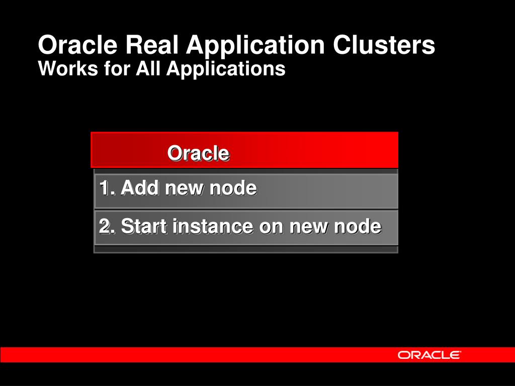 Oracle 1. Add new node 2. Start instance on new node Oracle Real Application Clusters Works for All Applications No Code Change