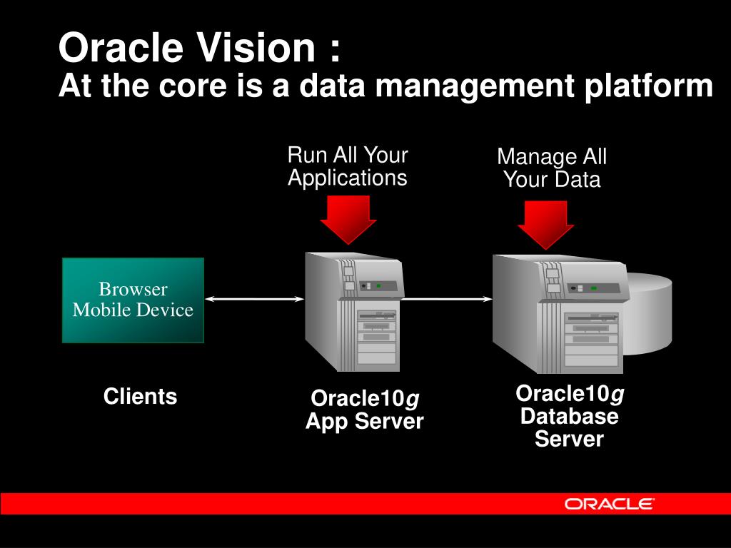Oracle Vision :At the core is a data management platform Run All Your Applications Manage All Your Data Browser Mobile Device Oracle10g Database Server Clients Oracle10g App Server