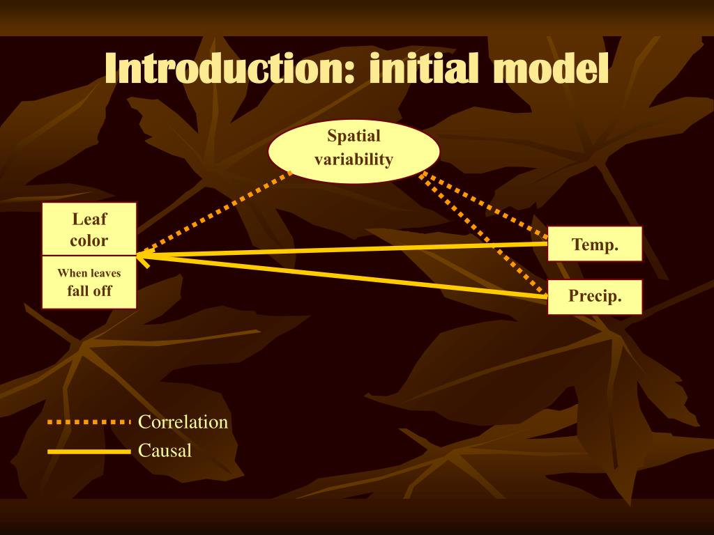Introduction: initial model Correlation Causal Spatial variability Leaf color Temp. When leaves fall off Precip.