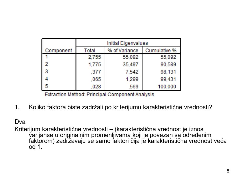 Koliko faktora biste zadržali po kriterijumu karakteristične vrednosti? Dva Kriterijum karakteristične vrednosti – (karakteristična vrednost je iznos varijanse u originalnim promenljivama koji je povezan sa određenim faktorom) zadržavaju se samo faktori čija je karakteristična vrednost veća od 1.