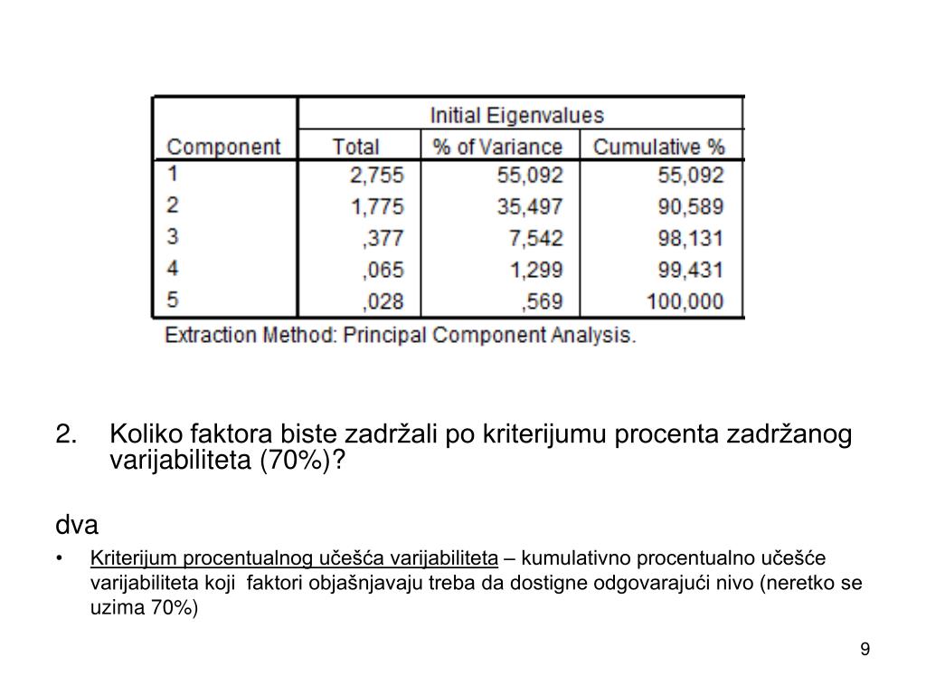 Tabelakarakteristicnihvrednosti • Koliko varijabiliteta originalnih varijabli objašnjava prvi faktor? Drugi? • Prvi faktor objašnjava 55% ukupnog varijabiliteta ovih pet varijabli u analizi, a drugi faktor dodatnih 35% varijabiliteta.