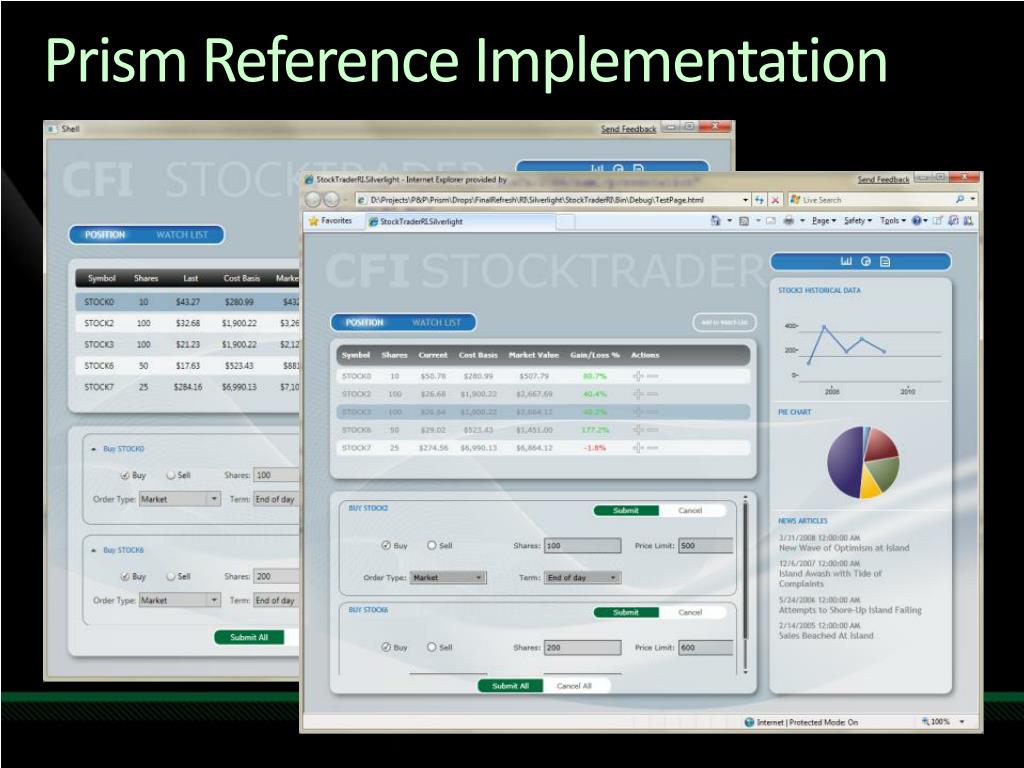 Prism – What’s In The Box? • Prism – Composite Client Application Guidance for WPF and Silverlight • Library • Reference Implementation • Documentation • Quick-Starts & How-To’s • Community – CodePlex • Prism 1.0 – WPF • Released July 2008 • Prism 2.0 – WPF & Silverlight • Released Feb 2009