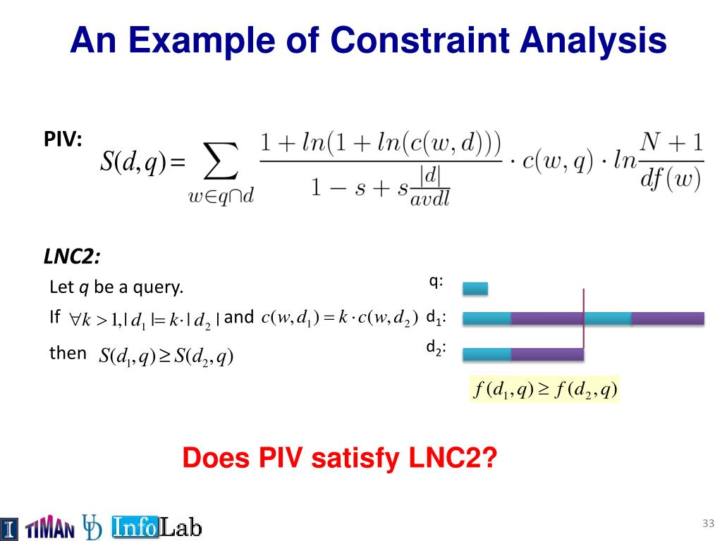 LNC2: q: Let q be a query. If and d1: d2: then An Example of Constraint Analysis PIV: Does PIV satisfy LNC2?