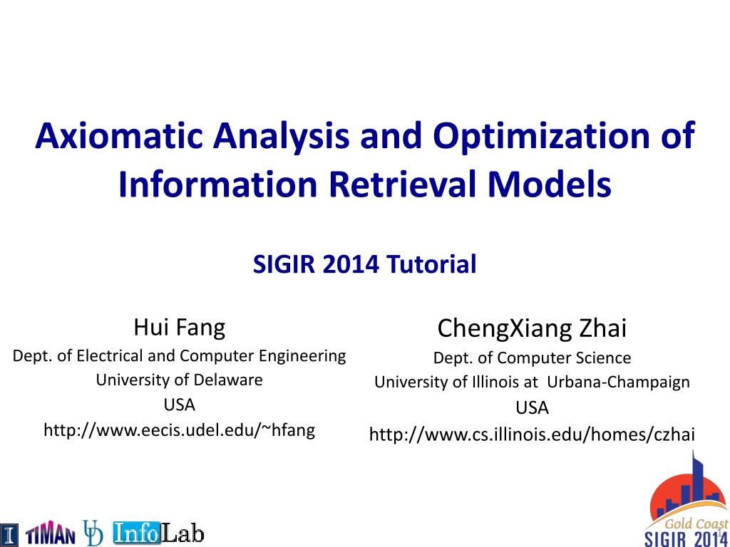 Axiomatic Analysis and Optimization of InformationRetrieval ModelsSIGIR 2014 Tutorial Hui Fang Dept. of Electrical and Computer Engineering University of Delaware USA http://www.eecis.udel.edu/~hfang ChengXiangZhai Dept. of Computer Science University of Illinois at Urbana-Champaign USA http://www.cs.illinois.edu/homes/czhai