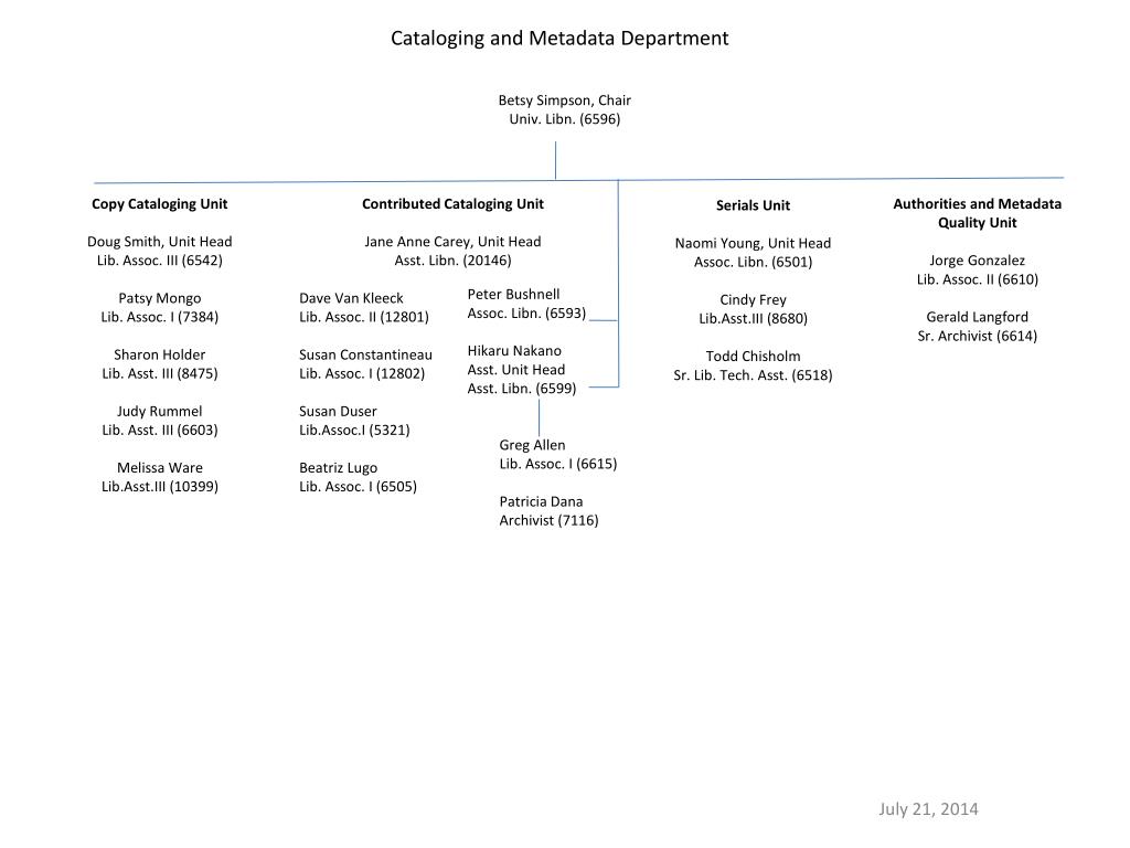 Cataloging and Metadata Department Betsy Simpson, Chair Univ. Libn. (6596) Copy Cataloging Unit Doug Smith, Unit Head Lib. Assoc. III (6542) Patsy Mongo Lib. Assoc. I (7384) Sharon Holder Lib. Asst. III (8475) Judy Rummel Lib. Asst. III (6603) Melissa Ware Lib.Asst.III (10399) Contributed Cataloging Unit Jane Anne Carey, Unit Head Asst. Libn. (20146) Dave Van Kleeck Lib. Assoc. II (12801) Susan Constantineau Lib. Assoc. I (12802) Susan Duser Lib.Assoc.I(5321) Beatriz Lugo Lib. Assoc. I (6505) Authorities and Metadata Quality Unit Jorge Gonzalez Lib. Assoc. II (6610) Gerald Langford Sr. Archivist (6614) Serials Unit Naomi Young, Unit Head Assoc. Libn. (6501) Cindy Frey Lib.Asst.III (8680) Todd Chisholm Sr. Lib. Tech. Asst. (6518) • Peter Bushnell • Assoc. Libn. (6593) • Hikaru NakanoAsst. Unit Head • Asst. Libn. (6599) • Greg Allen • Lib. Assoc. I (6615) • Patricia Dana • Archivist (7116) July 21, 2014