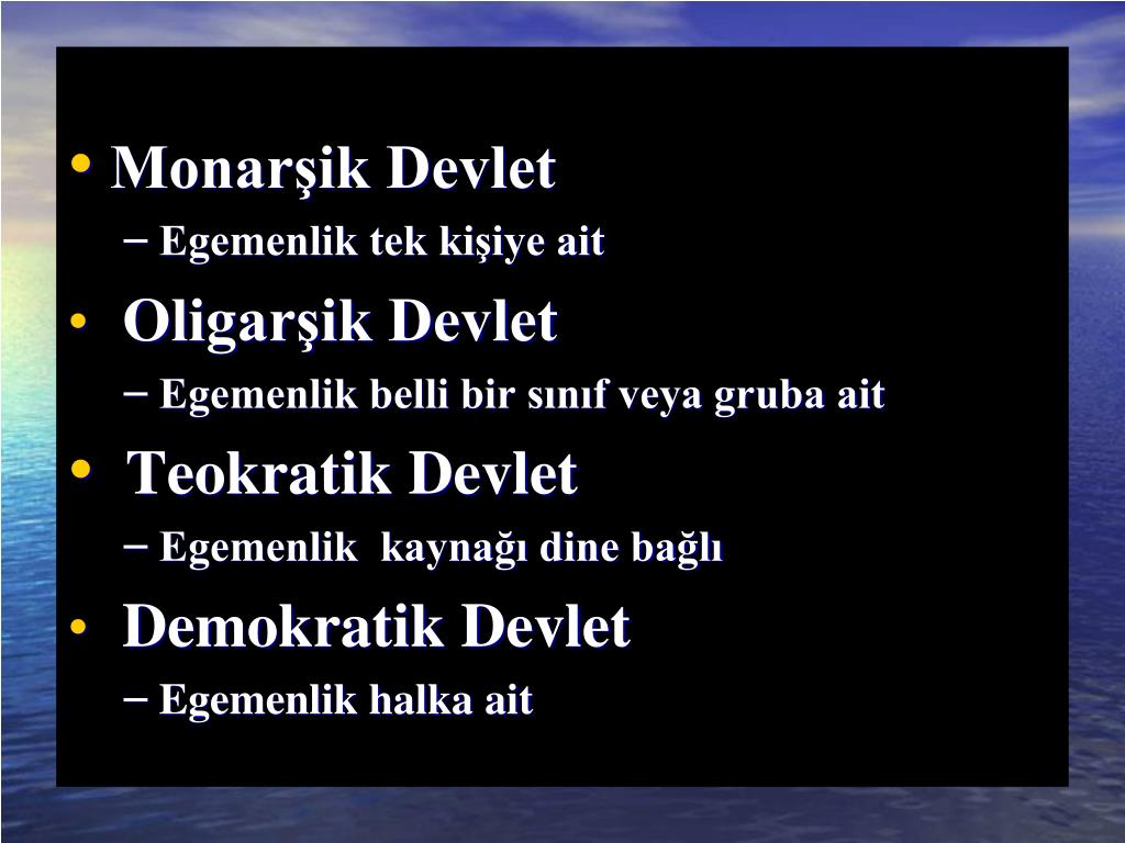Monarşik Devlet Egemenlik tek kişiye ait Oligarşik Devlet Egemenlik belli bir sınıf veya gruba ait Teokratik Devlet Egemenlik kaynağı dine bağlı Demokratik Devlet Egemenlik halka ait