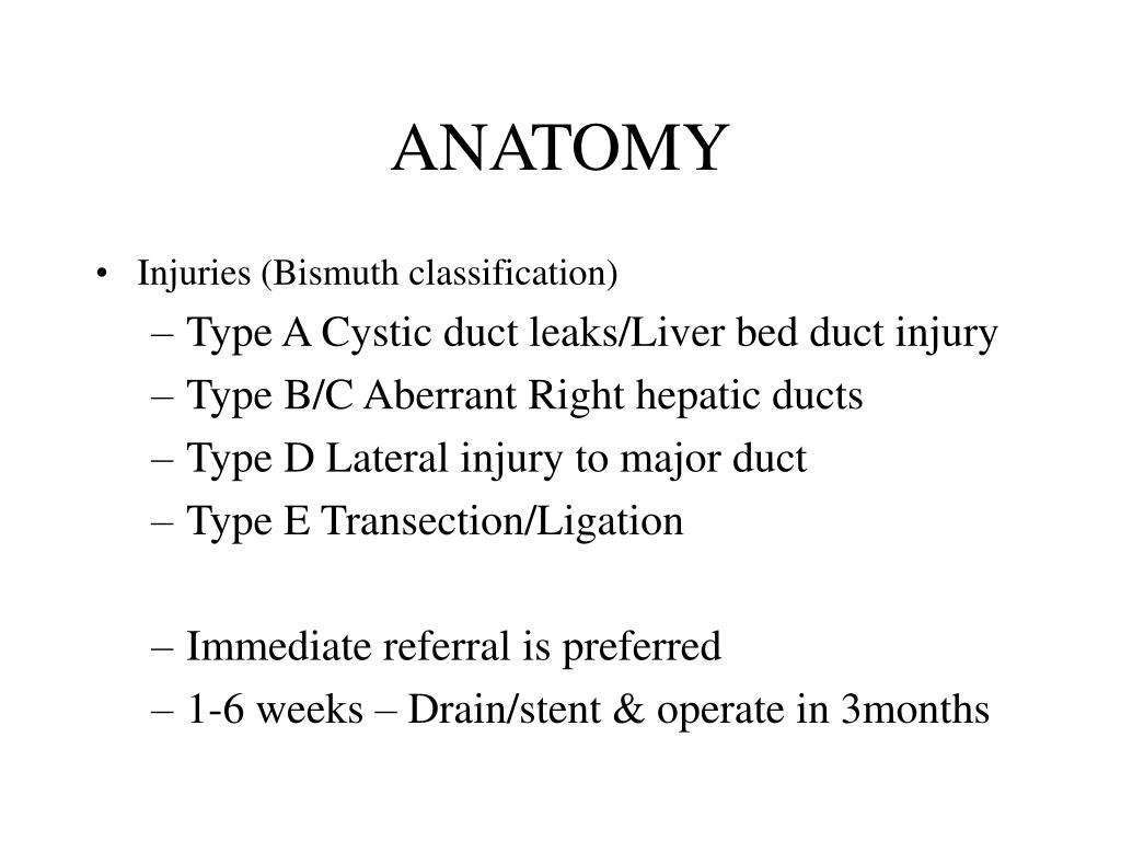 ANATOMY • Injuries (Bismuth classification) • Type A Cystic duct leaks/Liver bed duct injury • Type B/C Aberrant Right hepatic ducts • Type D Lateral injury to major duct • Type E Transection/Ligation • Immediate referral is preferred • 1-6 weeks – Drain/stent & operate in 3months