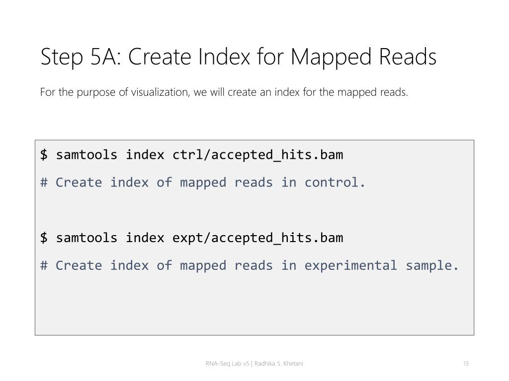 Step 5A: Create Index for Mapped Reads For the purpose of visualization, we will create an index for the mapped reads. $ samtools index ctrl/accepted_hits.bam # Create index of mapped reads in control. $ samtools index expt/accepted_hits.bam # Create index of mapped reads in experimental sample. RNA-Seq Lab v5 | Radhika S. Khetani