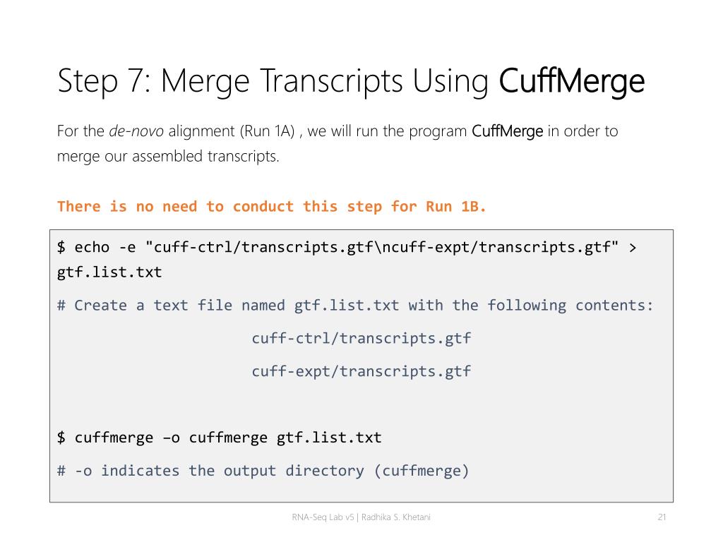 Step 7: Merge Transcripts Using CuffMerge For the de-novo alignment (Run 1A) , we will run the program CuffMergein order to merge our assembled transcripts. There is no need to conduct this step for Run 1B. $ echo -e "cuff-ctrl/transcripts.gtf\ncuff-expt/transcripts.gtf" > gtf.list.txt # Create a text file named gtf.list.txt with the following contents: cuff-ctrl/transcripts.gtf cuff-expt/transcripts.gtf $ cuffmerge –o cuffmerge gtf.list.txt # -o indicates the output directory (cuffmerge) RNA-Seq Lab v5 | Radhika S. Khetani