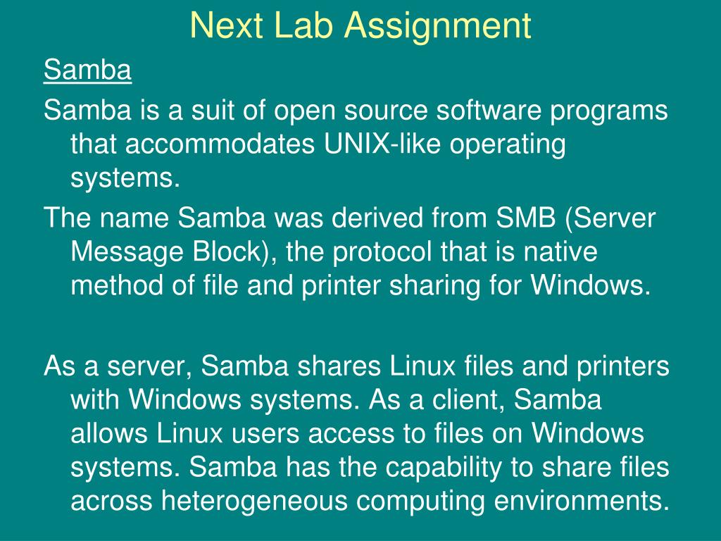 Next Lab Assignment Samba Samba is a suit of open source software programs that accommodates UNIX-like operating systems. The name Samba was derived from SMB (Server Message Block), the protocol that is native method of file and printer sharing for Windows. As a server, Samba shares Linux files and printers with Windows systems. As a client, Samba allows Linux users access to files on Windows systems. Samba has the capability to share files across heterogeneous computing environments.