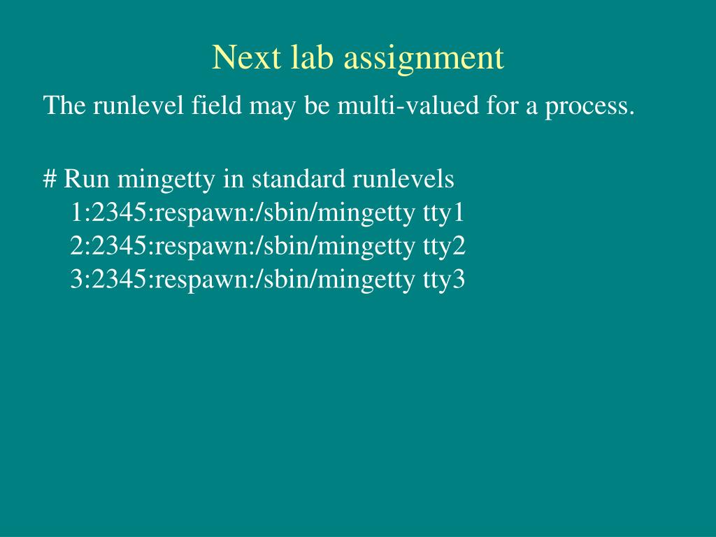 Next lab assignment The runlevel field may be multi-valued for a process. # Run mingetty in standard runlevels 1:2345:respawn:/sbin/mingetty tty1 2:2345:respawn:/sbin/mingetty tty2 3:2345:respawn:/sbin/mingetty tty3