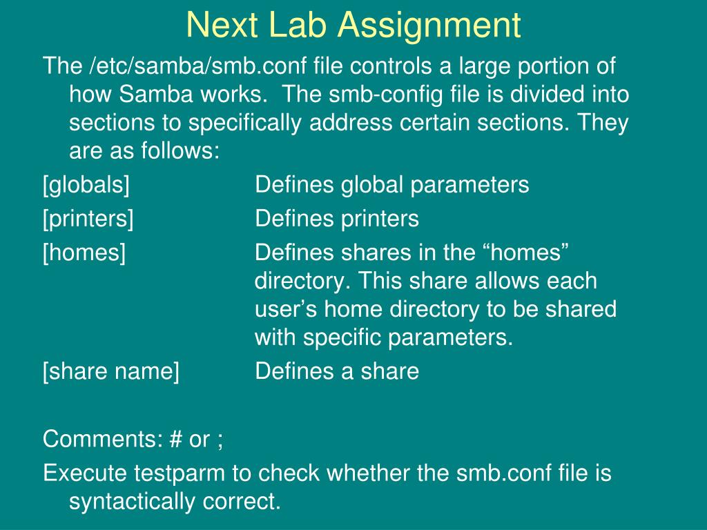 Next Lab Assignment The /etc/samba/smb.conf file controls a large portion of how Samba works. The smb-config file is divided into sections to specifically address certain sections. They are as follows: [globals] Defines global parameters [printers] Defines printers [homes] Defines shares in the “homes” directory. This share allows each user’s home directory to be shared with specific parameters. [share name] Defines a share Comments: # or ; Execute testparm to check whether the smb.conf file is syntactically correct.