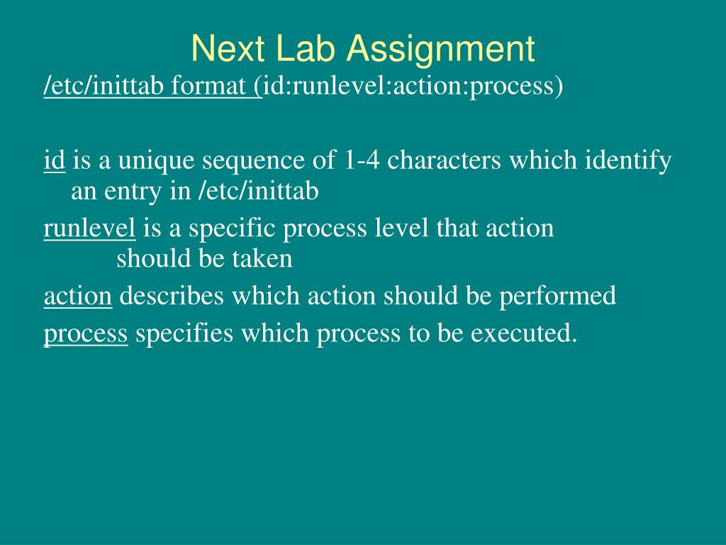 Next Lab Assignment /etc/inittabformat (id:runlevel:action:process) id is a unique sequence of 1-4 characters which identify an entry in /etc/inittab runlevel is a specific process level that action should be taken action describes which action should be performed process specifies which process to be executed.